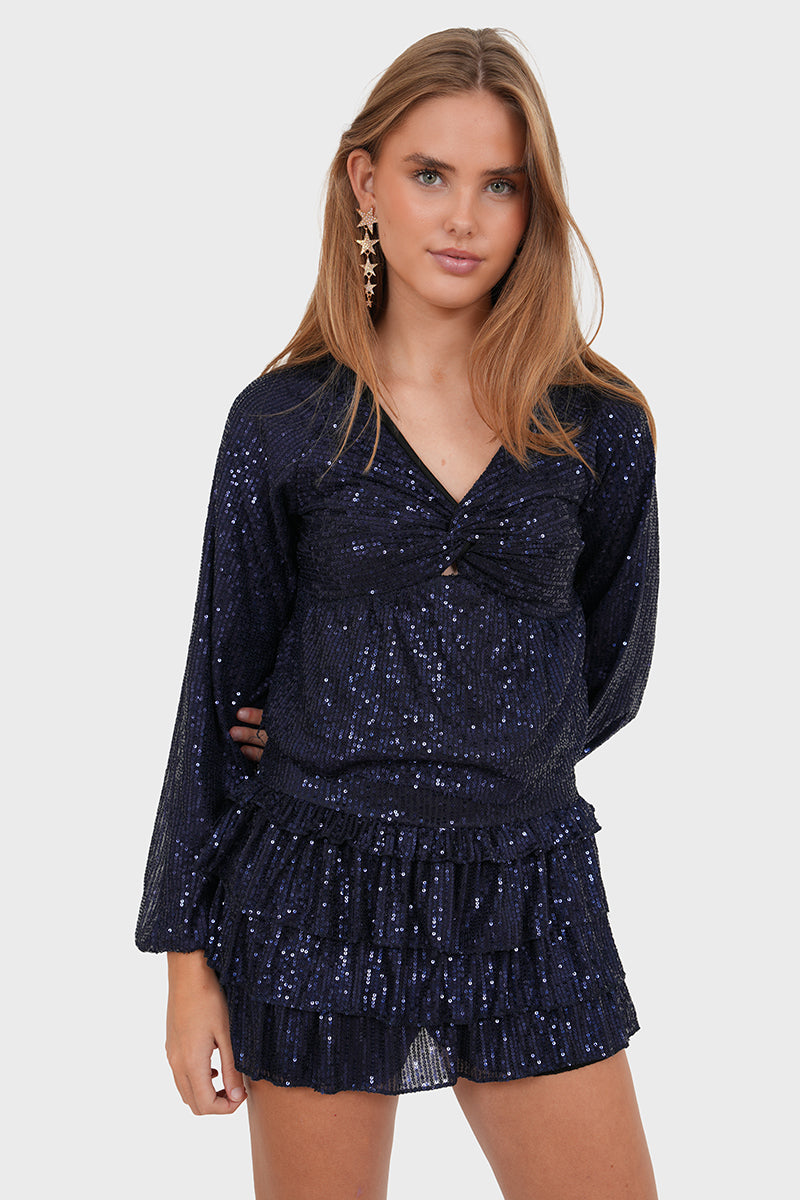 Get ready for the party season! 🪩 Deze zilveren glittertop is een echte party essential ✨ Door het twist-detail aan de voorkant en de wijd uitlopende mouwen heeft deze top een super mooie fit. Combineer met een bijpassend rokje voor een complete feestlook!