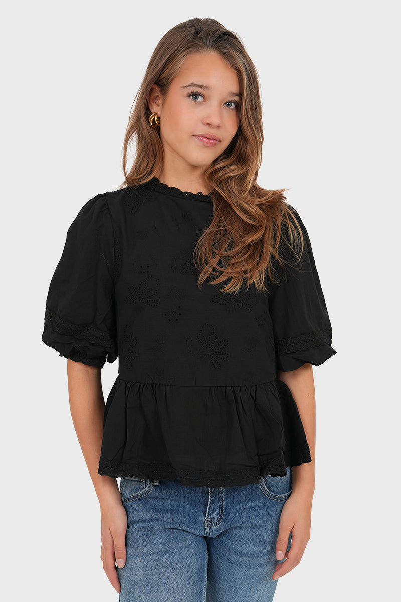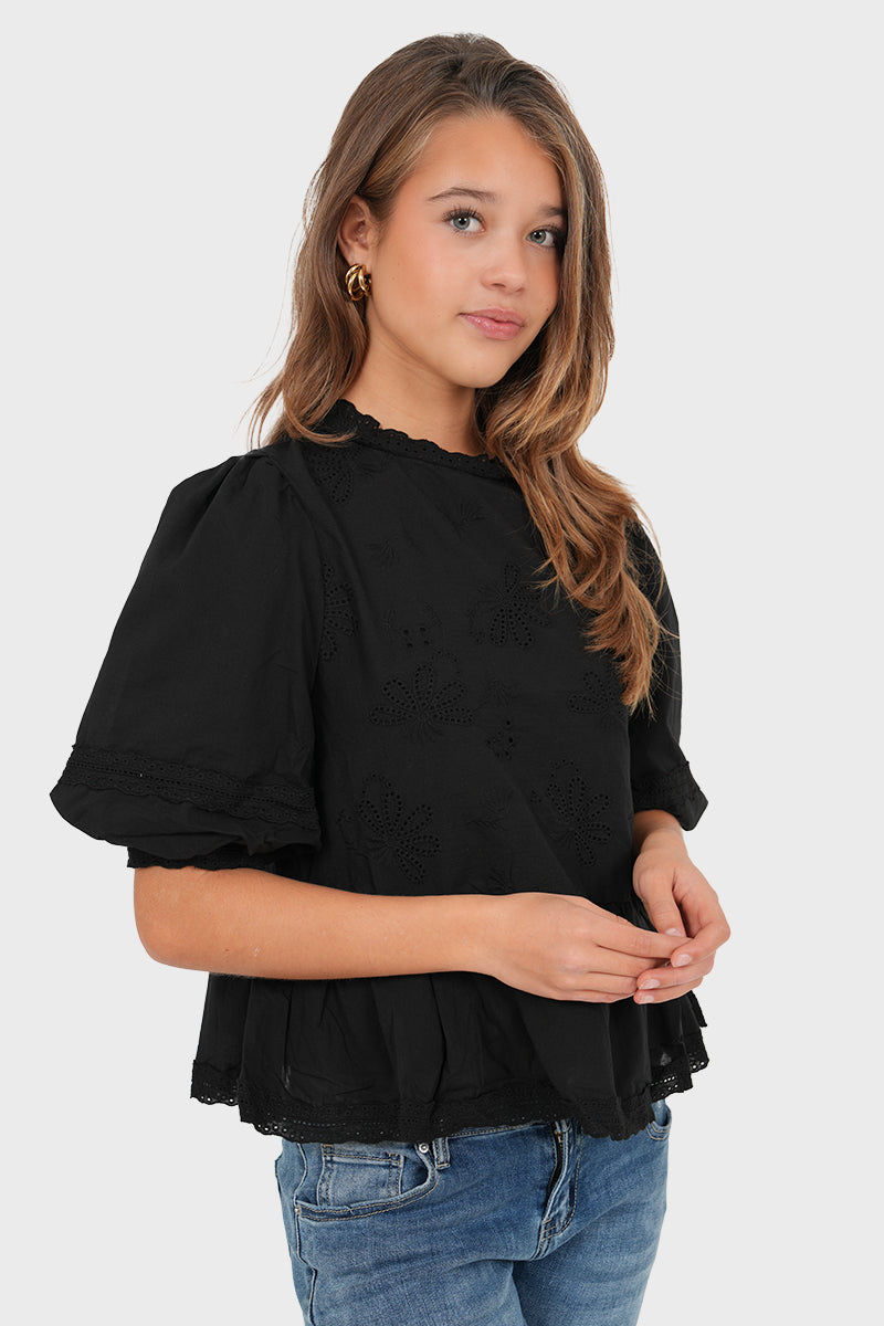 Diese Bluse mit Puffärmeln und Stickereidetails verleiht jedem Outfit eine superschöne Note💞 Kombinieren Sie die Bluse mit einer unserer Jeans für einen kompletten Look!