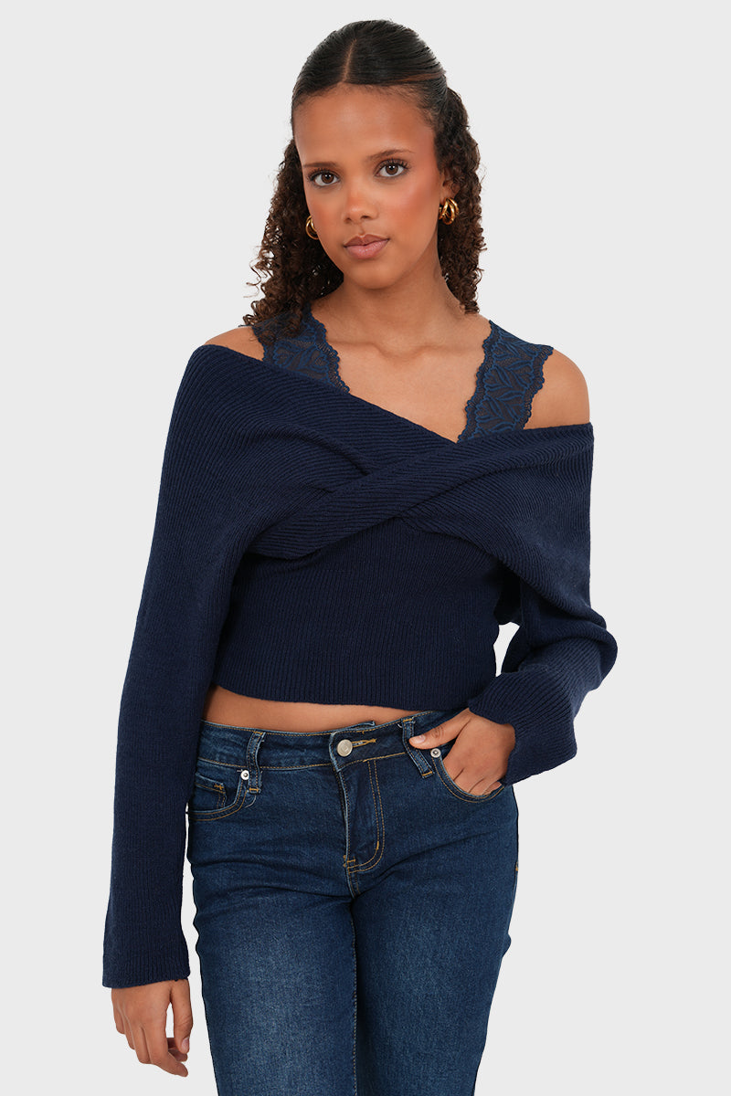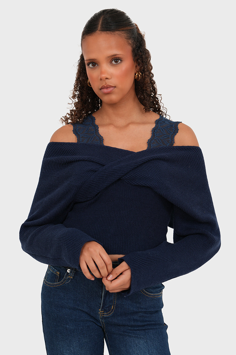 Shop dit super leuke gebreide truitje! De trui valt off shoulder en heeft een mega leuk kanten detail. De trui is gemaakt van een zacht stofje. Perfect om te combineren op een van onze jeans!