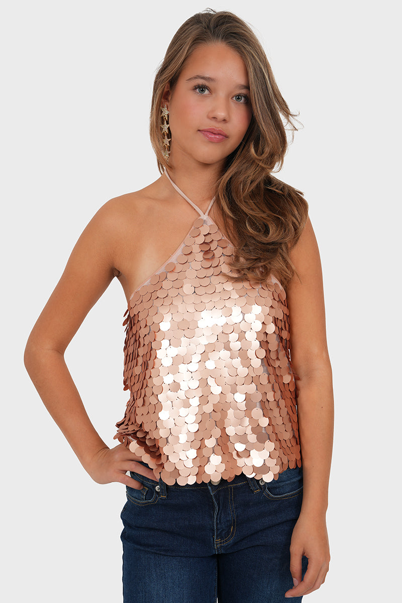 Get ready for the party season! 🪩 Deze roségouden haltertop met oversized pailletten is dé eyecatcher voor jouw party look. De halterfit een open rug geven een super mooie touch aan de top. Verkrijgbaar in meerdere leuke kleurtjes! ✨