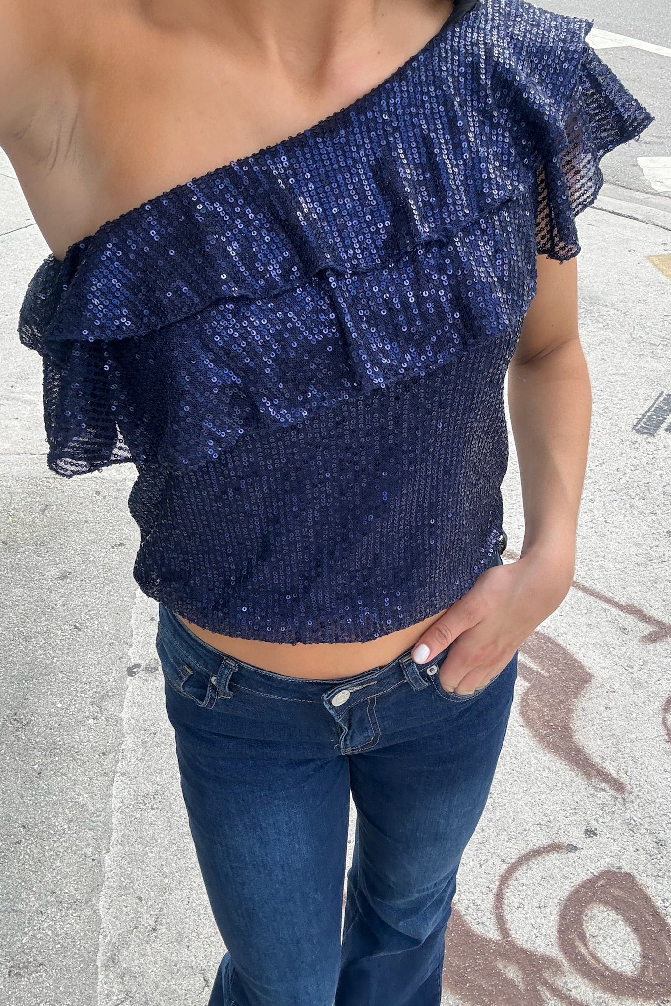 Get ready for the party season! 🪩 Deze navy glittertop met ruffle detail is een echte eyecatcher. De one-shoulder fit geeft een super leuke touch, terwijl de all-over pailletten zorgen voor een shiny look. 🖤