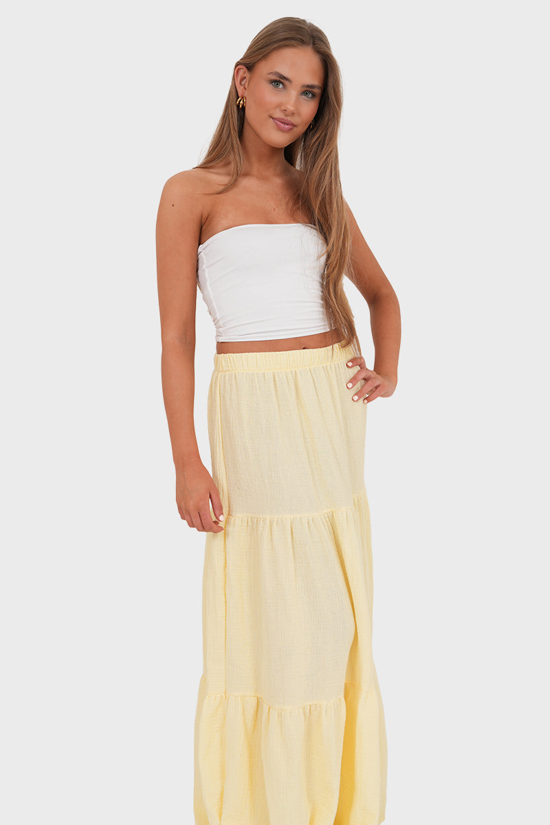 This soft yellow maxi skirt has a long, flowy fit that falls loosely. Made from a lightweight fabric that feels comfortable on warm days. Easy to pair with a basic top or your favorite blouse for a simple but cute look.