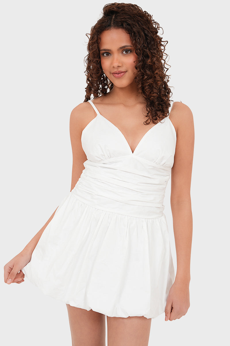 Get ready to turn heads this summer. Dit korte witte jurkje met dunne bandjes en een V-hals is zowel comfy als cute. De strakke taille geeft een fijne pasvorm, terwijl de ballonrok een speelse touch geeft. Style met slippers, je favoriete zonnebril of een leuke tas en je bent helemaal summer-ready! 🤍