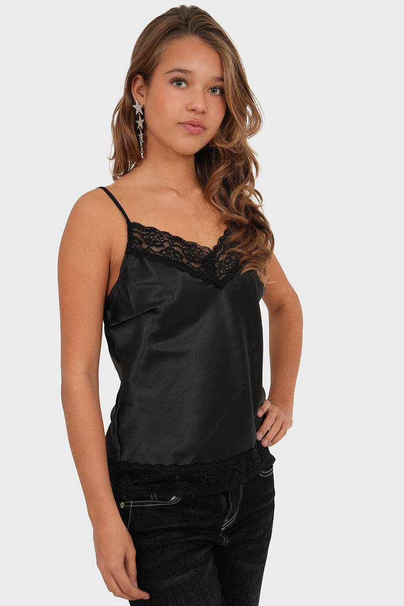 Get ready for the party season! 🪩 Deze zwarte satijnen top met kanten details is echt een musthave! De lace details geven een super mooie touch aan de top.💖 Style ‘m met jeans of met een rokje voor een complete look.