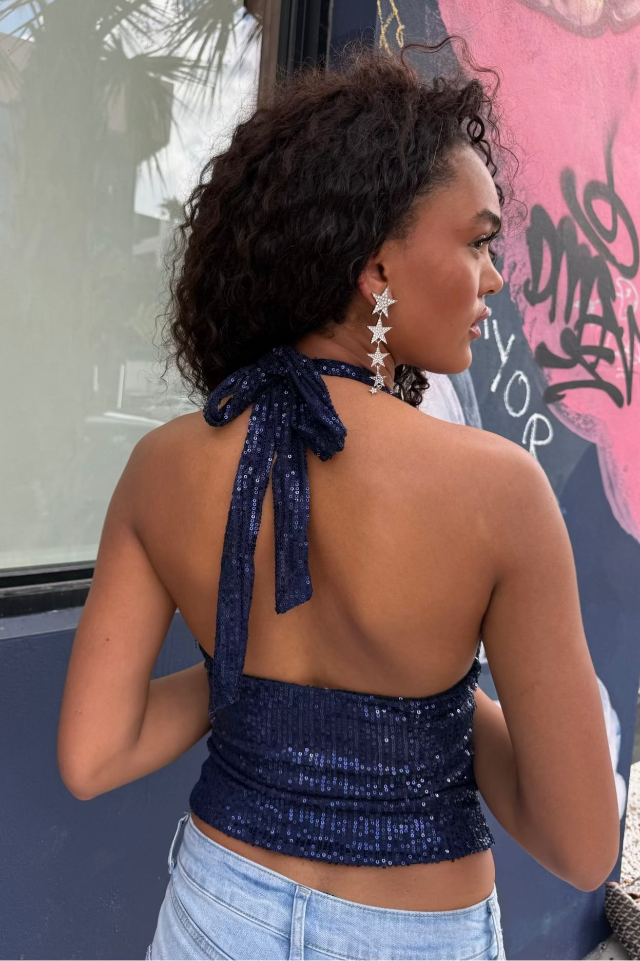 Get ready for the party season! 🪩 Deze haltertop met all-over pailletten is gemaakt om te shinen. De halterhals geeft een super mooie touch aan de top. Perfect om te combineren met een rokje voor een full party set of los met een jeans. ✨