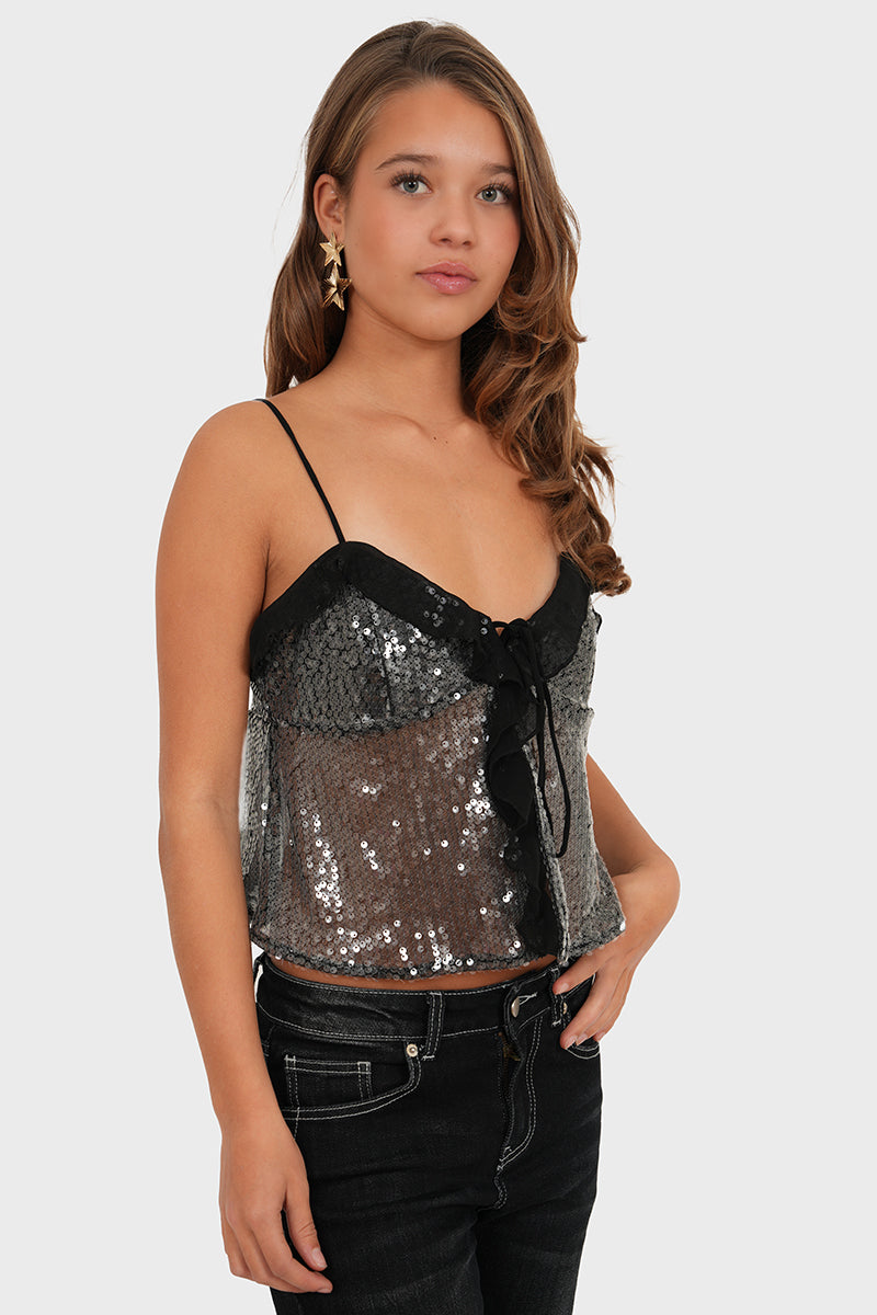 Get ready for the party season! 🪩 Deze zwarte glittertop met ruffles en strikdetail is de perfecte party top! Combineer met jeans of een rokje voor een complete outfit ✨ Ook verkrijgbaar in het roze!