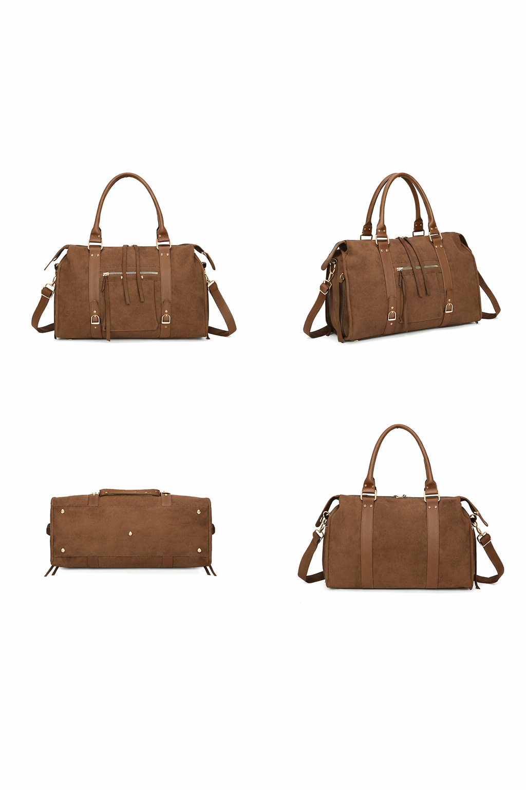 Este bolso de aspecto ante le da a tu conjunto un toque súper bonito. El modelo tiene asas cortas y una correa de hombro desmontable, para que también puedas llevarlo cruzado. Los detalles en color dorado completan el look.