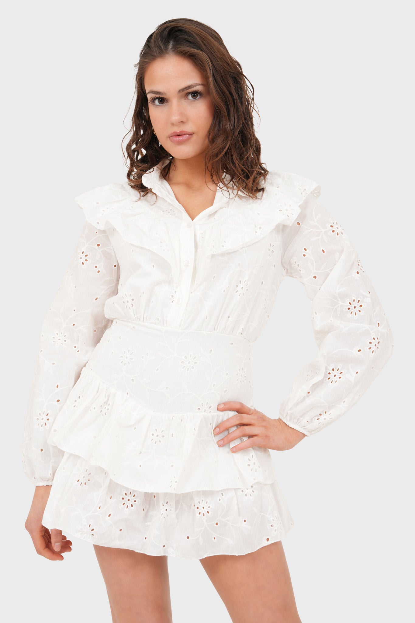 Dit jurkje is een echte must-have voor de zonnige dagen! Het witte broderie stofje voelt lekker luchtig aan. De licht getailleerde pasvorm accentueert mooi de taille. Combineer het jurkje met leuke laarsjes of ballerina's and you are ready to go!