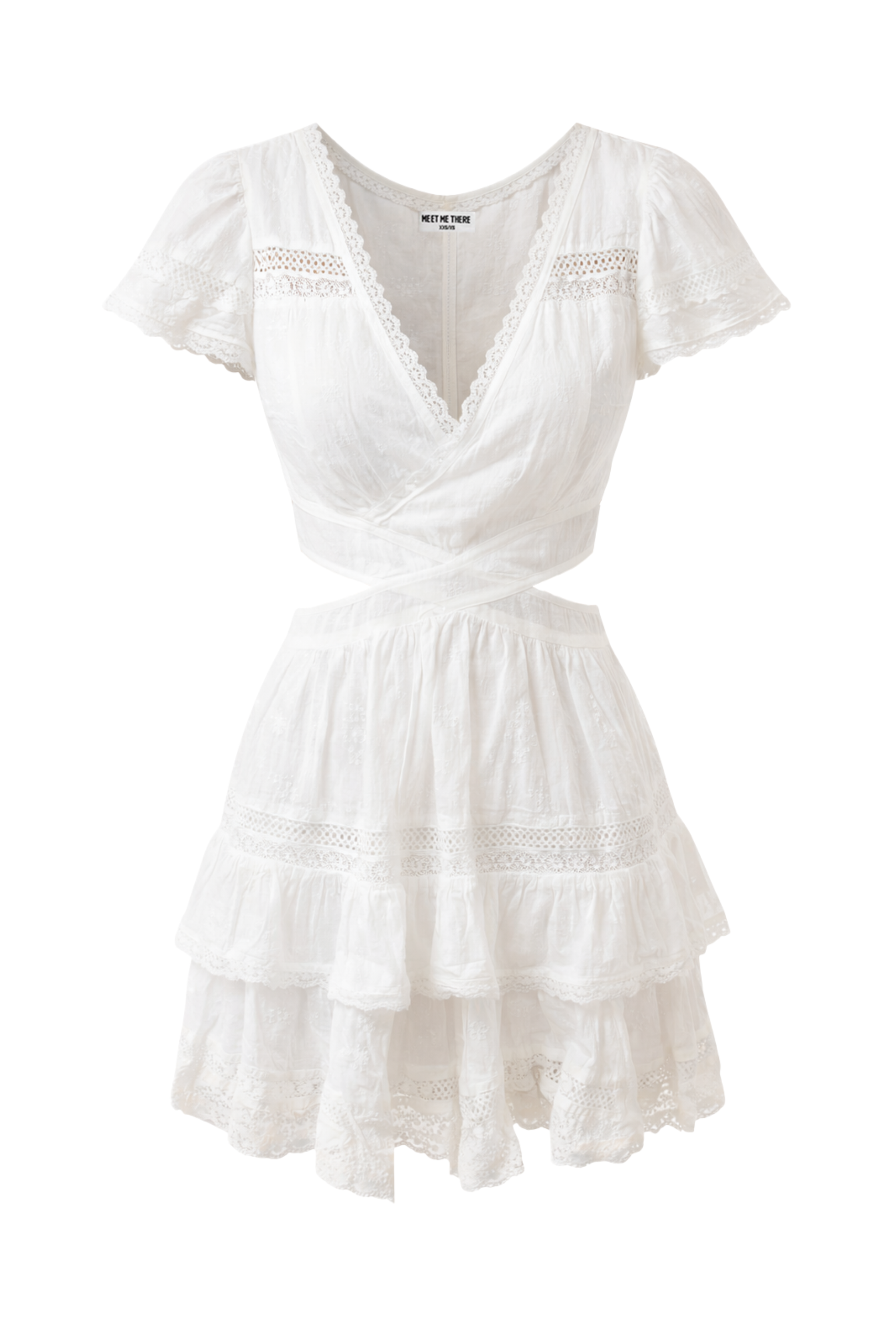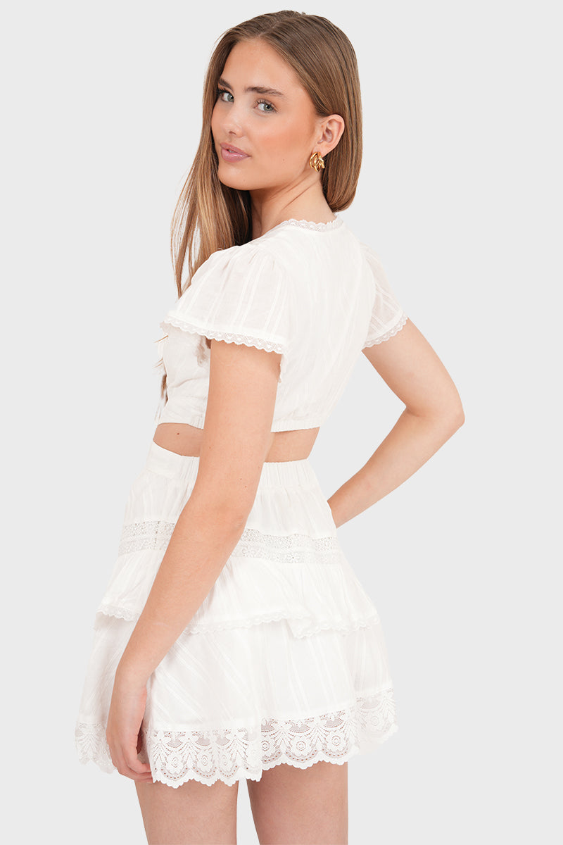 Føl sommerstemningen i denne luftige hvite kjolen! De vakre blonde-detaljene og V-halsen gir kjolen et mykt, romantisk uttrykk. Utskjæringene ved midjen gir en leken touch. Denne minikjolen er laget av bomull, noe som gjør den behagelig og komfortabel å ha på. Style med sandaler og gullsmykker for en enkel sommerlook.