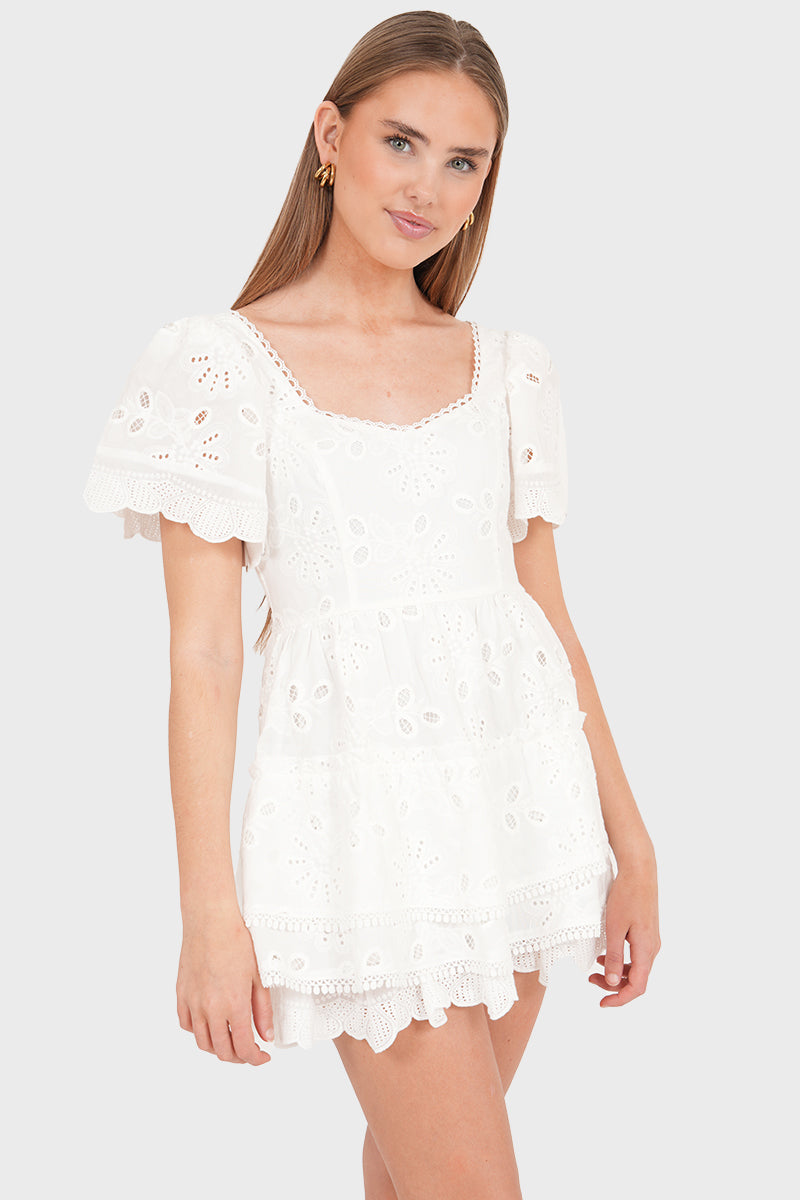 Din hvite kjole med broderidetaljer over hele og korte ermer er et ekte must-have. Det lagdelte skjørtet gir et lekent preg, og den er perfekt for varme dager. Kombiner med dine favoritt-tilbehør, så er looken komplett.