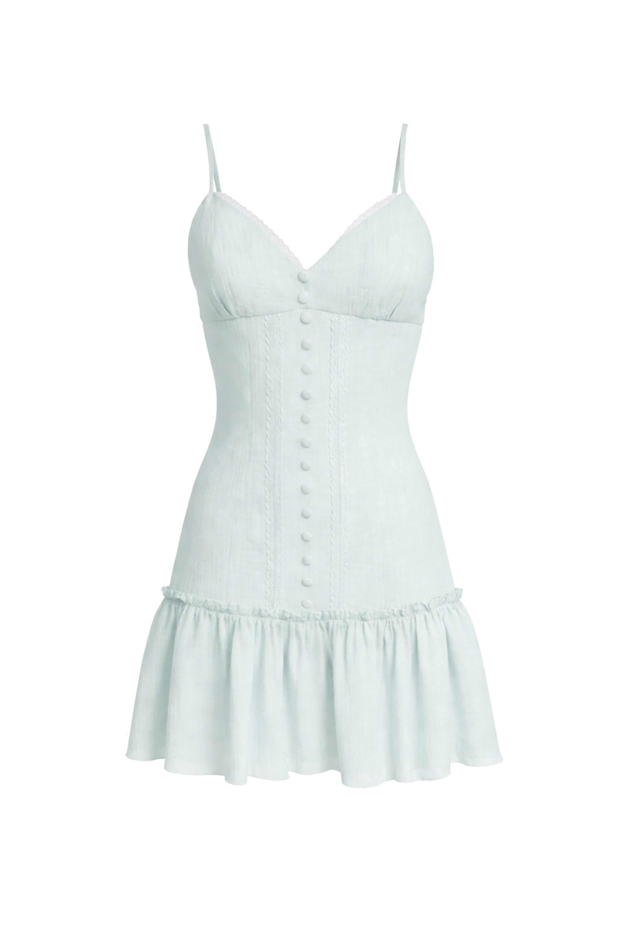 Denne lyseblå mini-kjolen er perfekt for varme sommerdager. De tynne stroppene og den subtile V-halsen gir et friskt uttrykk, og knappene foran gjør kjolen ekstra cute. Passformen slutter fint til kroppen og avsluttes i et lekent skjørt med ruffles for en girly vibe. Kombiner med sandaler eller hæler, så er du helt summer ready.