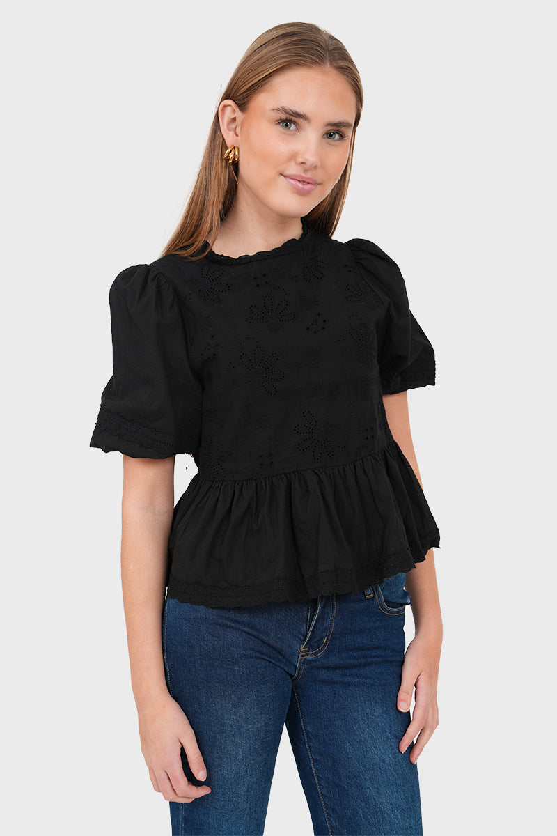 Denna blus med puffärmar och broderidetaljer ger varje outfit en superfin touch💞 Kombinera blusen med en av våra jeans för en komplett look!