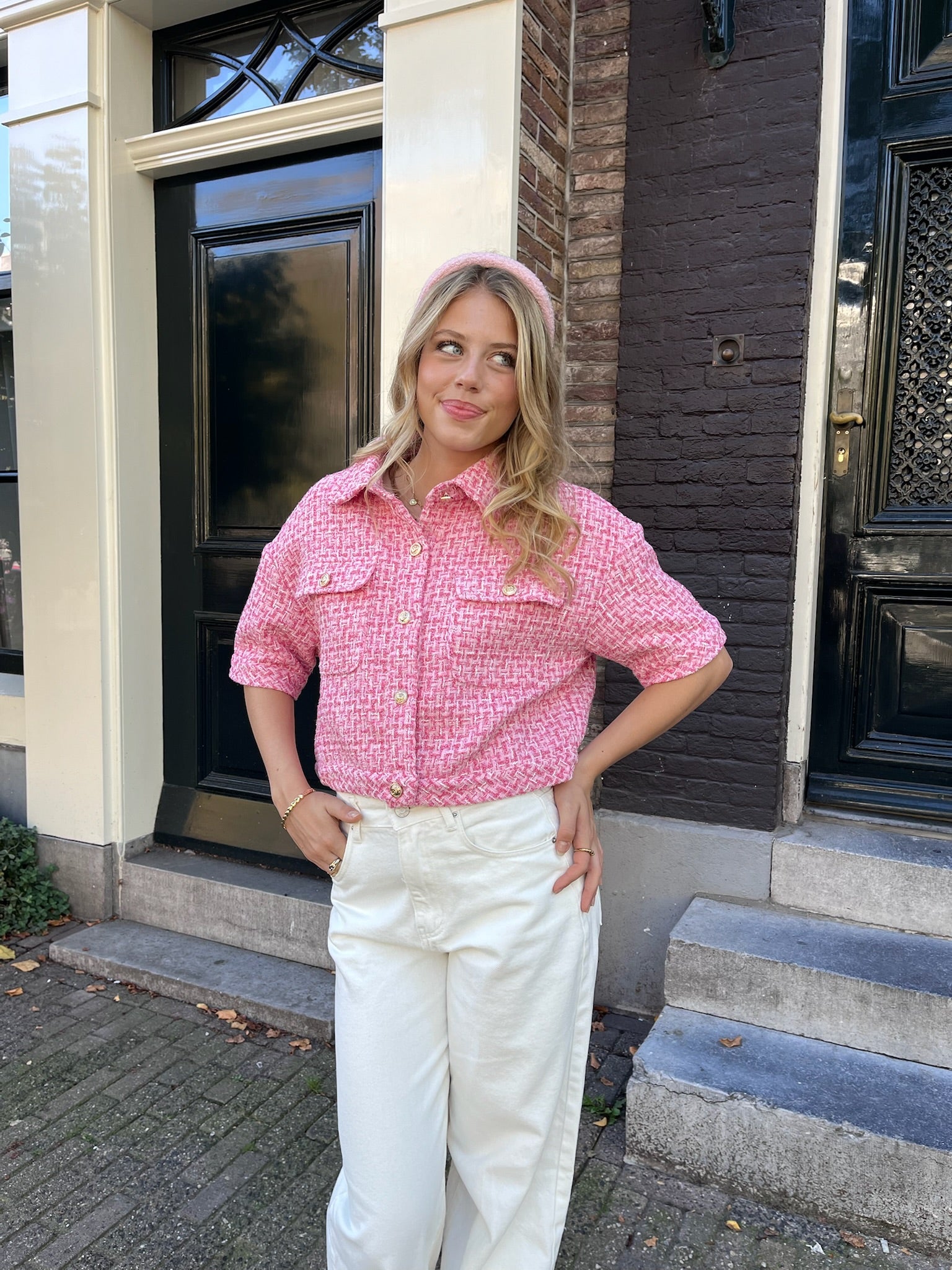 Denna rosa jacka är blickfånget som fulländar vilken outfit som helst ✨ Tweed- och guldknapparna ger jackan en supersöt touch. Perfekt med jeans för en komplett look! 🩷